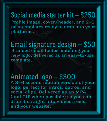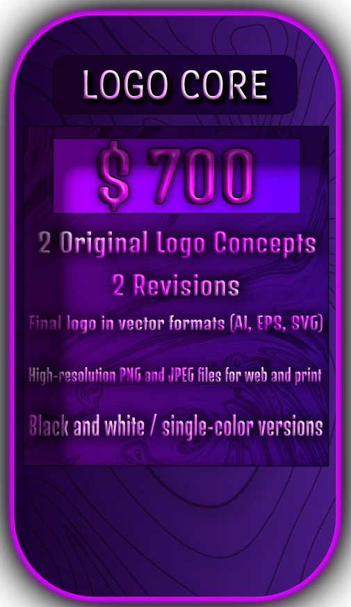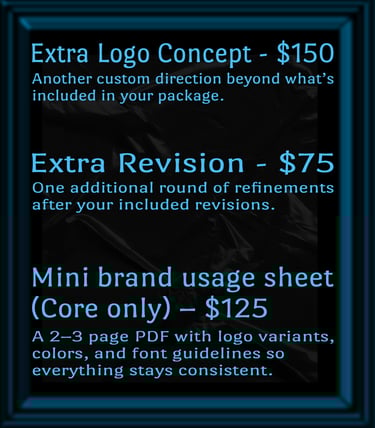 Good logos are not cheap, and cheap logos are not good. These packages are priced to give you thoughtful concepts, real revision time, and production-ready files that work everywhere your brand shows up.