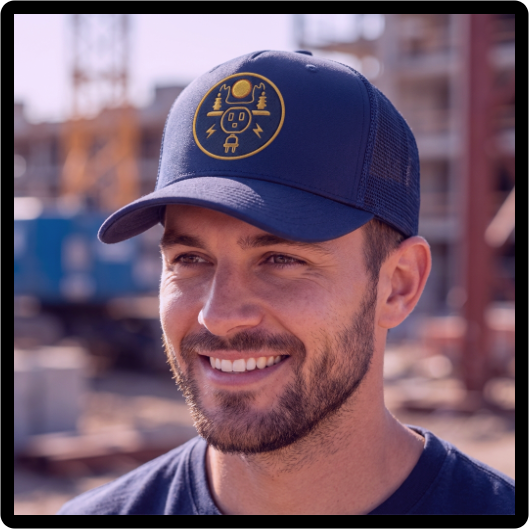 Symmetrical logo featuring circuit elements, lightning bolts, and power infrastructure. Designed for scalability across all mediums
