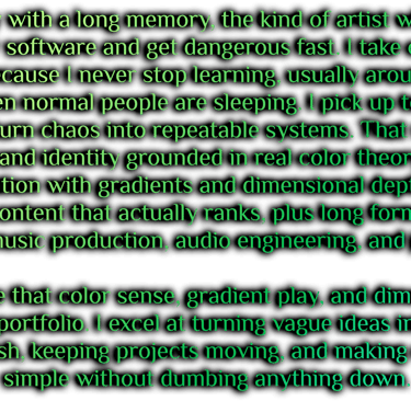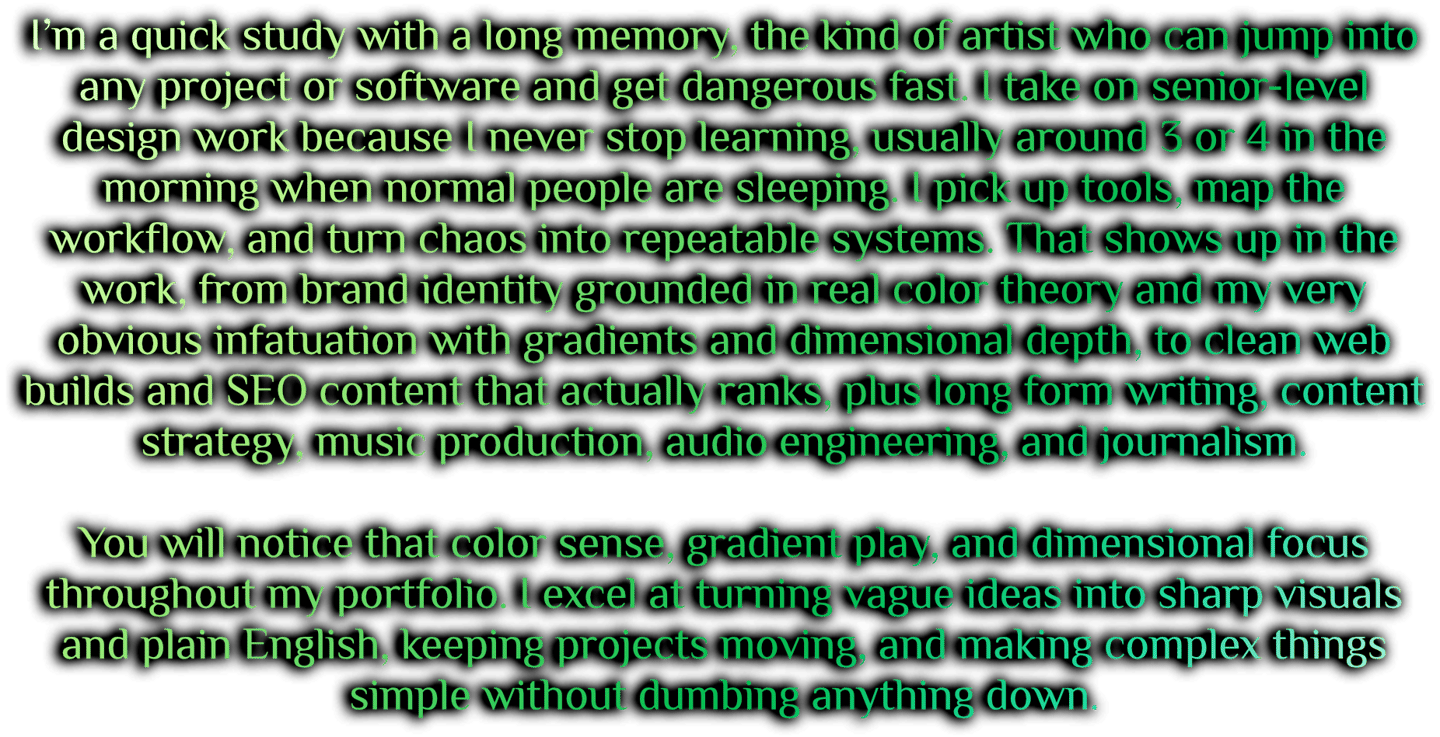 I’m a quick study with a long memory, the kind of artist who can jump into any project or software and get dangerous fast. I take on senior-level design work because I never stop learning, usually around 3 or 4 in the morning when normal people are sleeping. I pick up tools, map the workflow, and turn chaos into repeatable systems. That shows up in the work, from brand identity grounded in real color theory and my very obvious infatuation with gradients and dimensional depth, to clean web builds and SEO content that actually ranks, plus long form writing, content strategy, music production, audio engineering, and journalism.